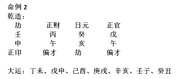 此例:癸水生于仲夏,又逢午时,财官太旺。喜其日元得地,更妙年干劫坐星有气,尤羡五行无木,则水不泄而火无助,壬水可用。且运走水得地,遗绪不丰,自创四五十万,一妻四妾八子。