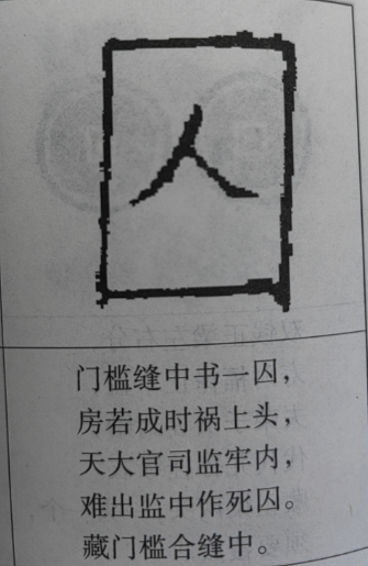 门槛缝中书一囚,房若成时祸上头,天大官司监牢内,难出监中作死囚。藏门槛合缝中。