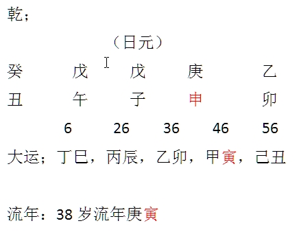 此例红鸾在寅,天喜在申,时上申天喜入命,38岁流年庚寅,寅是红鸾,当运行乙卯官杀用神旺地再逢庚寅流年,红鸾天喜齐而38岁结婚。
