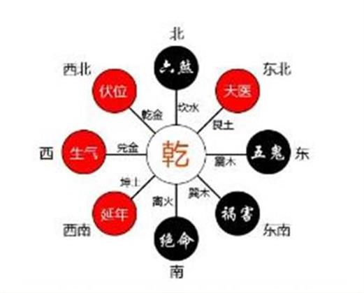 生气配贪狼星属木,阳木上吉。天医配巨门属土、阳土次吉。延年配武曲属金、阳金次吉。五鬼配廉贞属火,独火凶。绝命配破军属金、阴金大凶。六煞配文曲属水、阴水次凶。祸害配禄存星属土,阴土次凶。伏位配左辅,右弼。九星唯有左辅右弼吉凶随化而定。