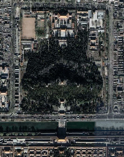 景山公园的神奇之处在于,你在卫星图上看它,它的轮廓是一尊坐像。这座坐像不是普通人,而是著名的真武大帝!
