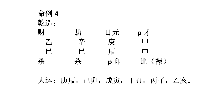 此造官杀乘权,原可畏也,然喜支拱印局,巧借栽培,流通水势,官星有理会也。第嫌初运庚申辛酉,生杀坏印,偃蹇功名;己未支全印局、干透食神,云程直上,仕至尚书。然有其命,必得其运,如不得其运,一介寒儒矣。