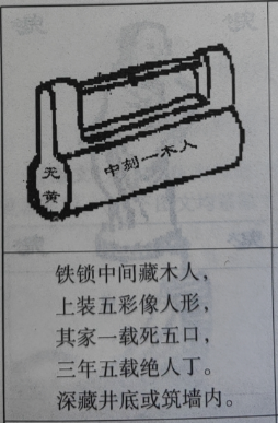 铁锁中间藏木人,上装五彩像人形,其家一载死五口三年五载绝人丁。深藏井底或筑墙内。