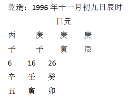 红鸾天喜三合局论法:三合者,申子辰三合水局,寅午戌三合火局,亥卯未三合木局,巳酉丑三合金局。比如说:某人生年为甲子,命局内月日时、命宫地支中有卯就是红鸾星入命,有酉就是天喜星入命,在青年后的大运或流年中,重复再有卯支出现在大运或流年支上,就是岁运临红鸾,同样甲子年生人,八字中月日时有酉支的,酉就是天喜临岁运,此人就有可能在这个卯大运或卯流年中结婚生子或好事临身,同样,甲子年生人,八字中月日时有酉支的,酉就是天喜,好事与喜事与红鸾同。甲子年生人,如果在命局内有卯或酉,此段的大运和流年是亥和未与卯成亥卯未三合局红鸾,有巳和丑成巳酉丑三合天喜,也主有婚子之喜或好事进门。同样,甲子年生人,月日时、命宫中无卯红鸾和酉天喜,遇到大运或流年是卯或酉与命局、大运、流年形成三合者也同样有婚子好事临身。如果命局、大运无红鸾天喜二星,单独流年支辰是红鸾或天喜,而且无三合局成局者也同样有婚子好事,只是应验几率低些。后面用几个实例八字来验证红鸾天喜的实际作用状况:
