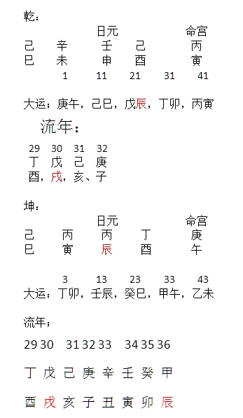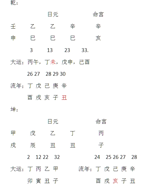 此例是一对曾经的夫妻,男者22岁丁酉流年临天喜合命局辰时,女者满局红鸾天喜(辰戌)23岁合流年丁酉,于丁酉年奉子成婚,惜乎于戊戌流年女方弃女离异。