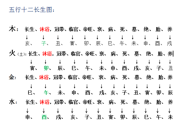 1三合局五行的关系(沐浴位),从起例中不难发现:亥卯未三合成五行木局、木“长生”在亥,顺排即是子,是“沐浴”位;巳酉丑三合金局,金长生在巳,沐浴在午;寅午戌三合火局,火长生在寅,沐浴在卯;申子辰三合水局,水长生在申,沐浴便是酉。五行土寄宫在火,土论长生、沐浴位与火相同。论五行的旺弱兴衰与休囚由十二长生诀而定论。